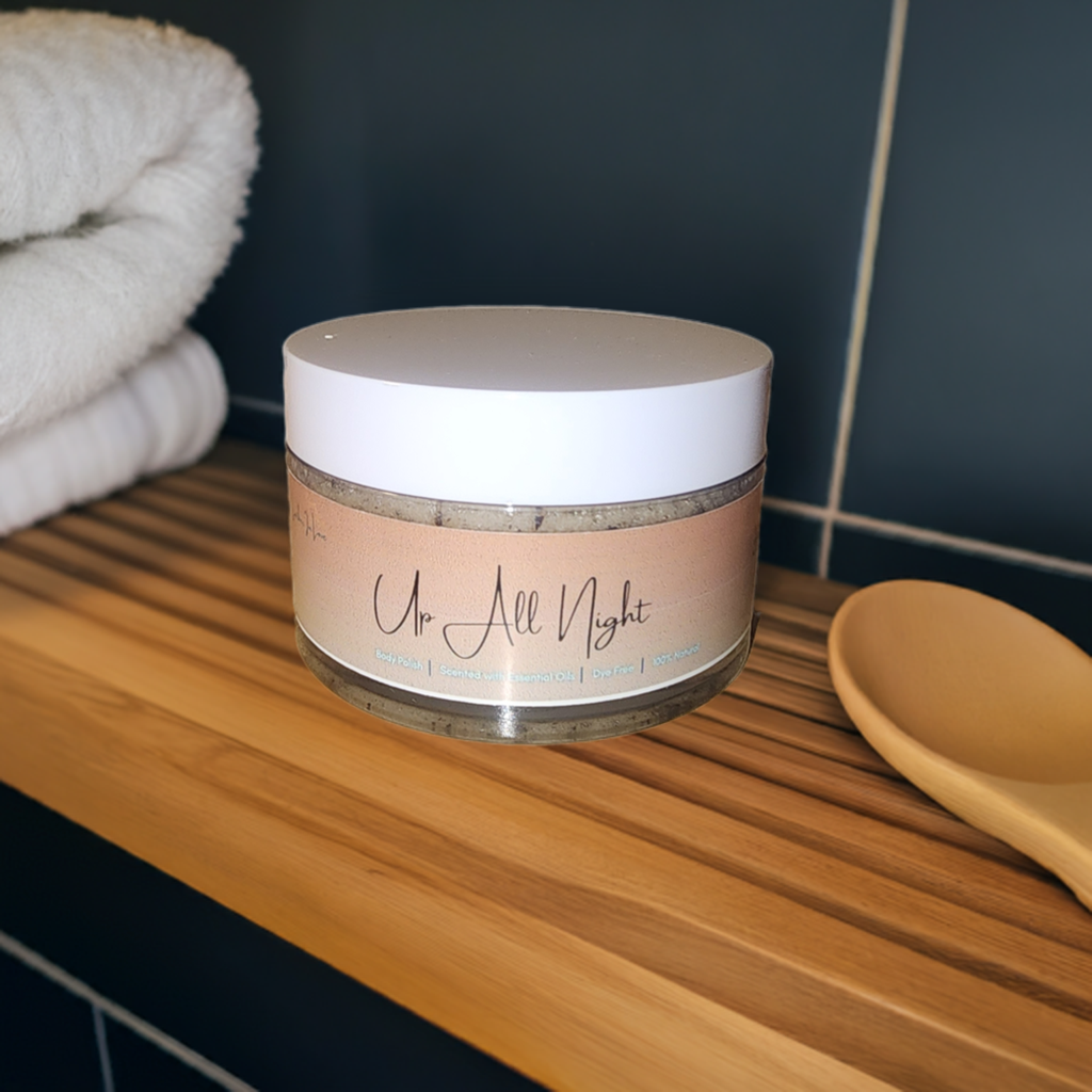 Up All Night- White Sugar, Brown Sugar, Ground Vanilla Coffee, Shea Butter, Foaming Bath Butter, Cocoa Butter, Grapeseed Oil, Safflower Oil, Coffee infused Avocado Oil, Essential Oil Blend, Vanilla Powder & Natural Preservative.